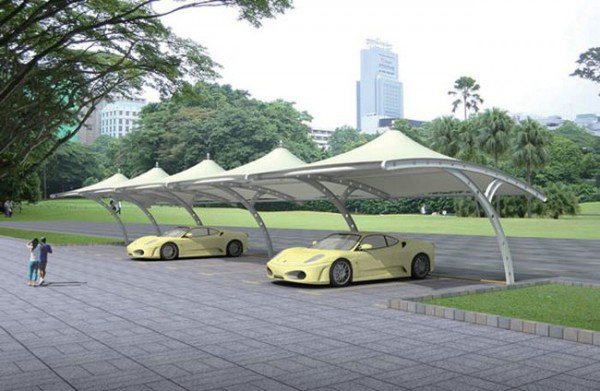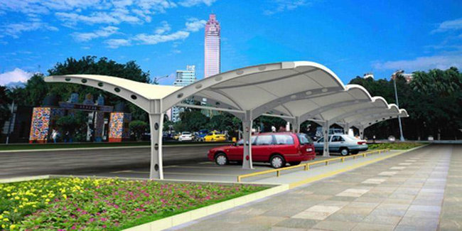 膜結(jié)構(gòu)停車棚以一種類似帳篷、充滿柔性的建筑越來越多地出現(xiàn)在城市廣場、公園邊上,以其優(yōu)美的曲線吸引了大眾的目光,其造型自由輕巧、阻燃、制作簡易、安裝便捷、節(jié)能、易于使用。作為一種特殊的現(xiàn)代建筑結(jié)構(gòu),以高強(qiáng)度柔韌性薄膜材料與張拉體系相結(jié)合,形成的具有一定剛度的空間結(jié)構(gòu)體。